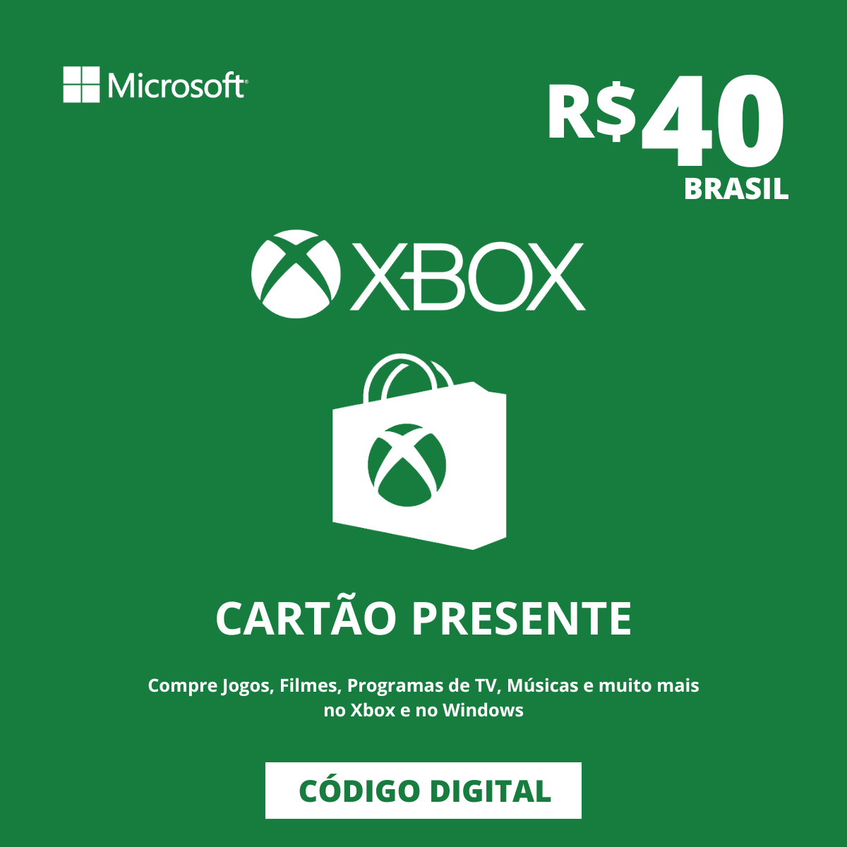 Dê o dom da escolha com o Gift Card Xbox 40 Reais Brasil - Código Digital. Este cartão presente é o passaporte para um universo de entretenimento no Xbox 360, Xbox One, e Xbox Series X|S. Perfeito para adquirir os jogos mais recentes, aplicativos indispensáveis, e muito mais, sem a preocupação de tarifas ou datas de expiração. O cartão presente Xbox é a solução ideal para quem deseja flexibilidade e variedade, válido para todas as compras na Microsoft Store online, no Windows, e no Xbox.